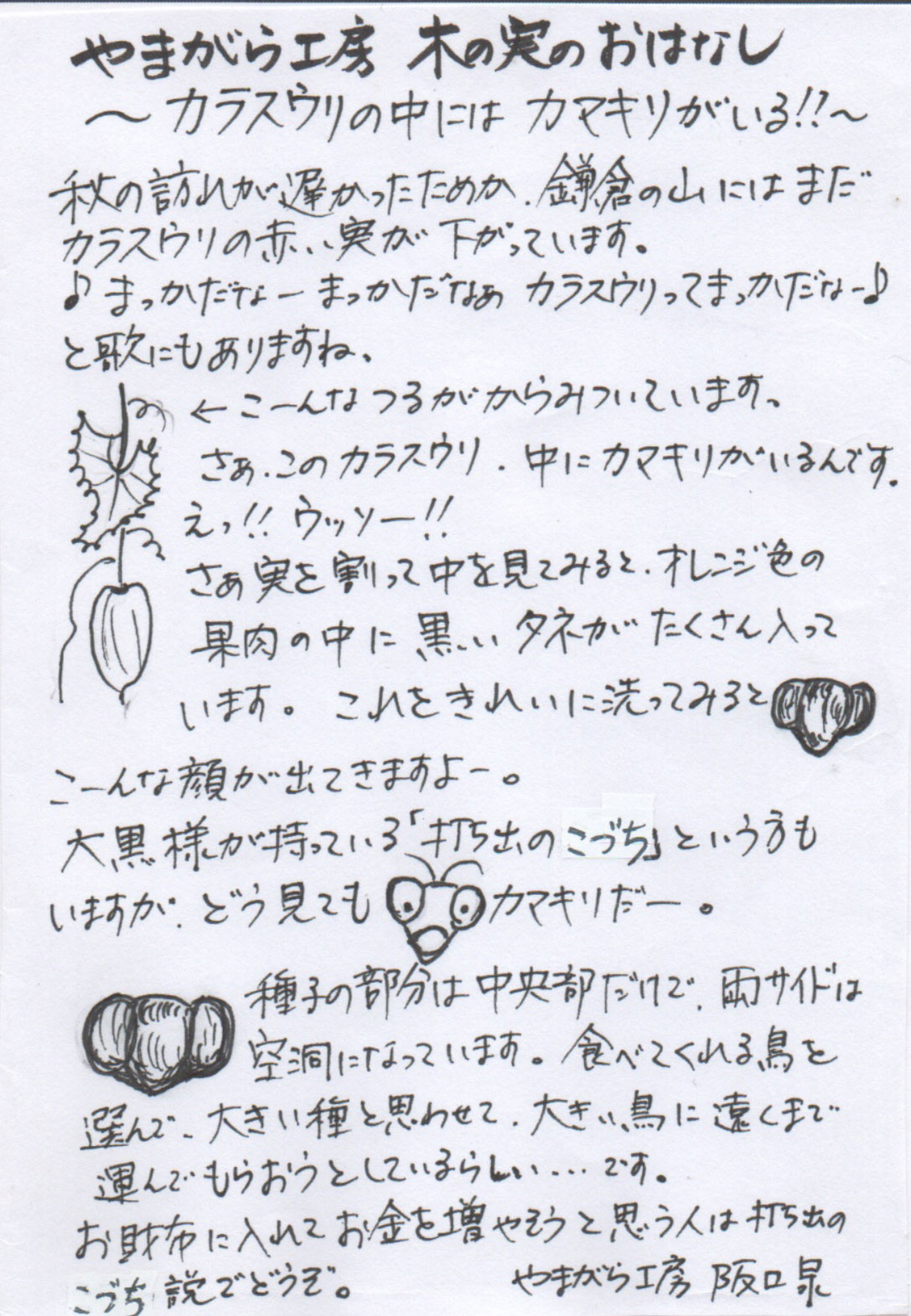AZU通信 NAOMI音楽教室 おいしい便り(KOMATSU) おかげさま日記(YOSHIZAWA) きし亀子の鎌倉歴史散歩(KAMEKO) きらくなたてものや日記( HIDAKA) くすりすく(TAKANASHI) たねのなか(MUKAI) やまがら工房 木の実のおはなし(YAMAGARA) イタリアからの手紙(KAWAMOTO) カジュに集う鳥たち(SAKAGUCHI) ノーテンキ通信(RYOKO) フォンテの畑から(fonte) 宇華さんの日々是好日( UKA) 巻頭エッセイ(TANAKA) 巻頭エッセイ手書き版(TSURU) 往復書簡 手毬の和菓子談義(TEMARI) 書と文字のまにまに(ISSHI) 特別寄稿(Contribute) 石倉正英の「テアトロ・カジュ」(ISHIKURA) 紙芝居師なっちゃん!(NACCHAN) 説明 鎌倉もののふ隊(MONONOF)